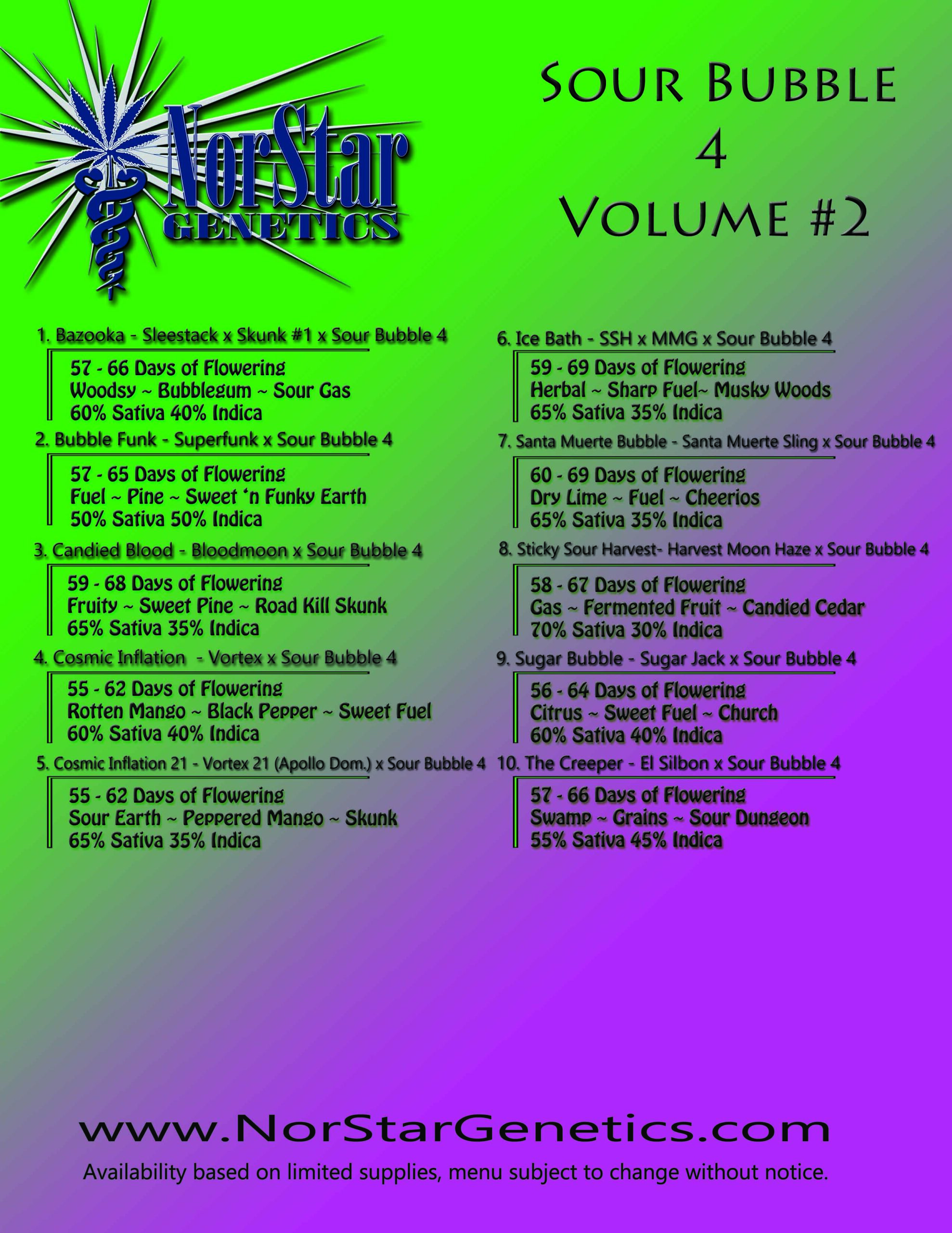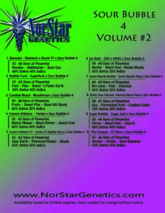 This menu features the Sour Bubble 4 from BOG Seeds and is a BX 4 of the famous Sour Bubble. Fast flowering times and short plants are a hallmark of this parent stock, while still delivering rich sumptuous flavors and a smooth fluid body buzz with upbeat cerebral vibes. These are great for indoor growers or home breeders looking for something short and sweet!